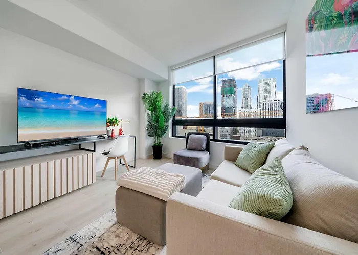 Sleek Escape-Resort-Style Stay With Pool Spa & More Miami villa ligt binnen 5 minuten wandelafstand van het Museum of Art and Design at Miami Dade College en verleidt gasten met een zwembad op het dak, een sauna om erin te ontspannen. Dit vakantiehuis biedt draadloos internet en bevindt zich binnen het bereik van het Patricia and Phillip Frost Museum of Science.